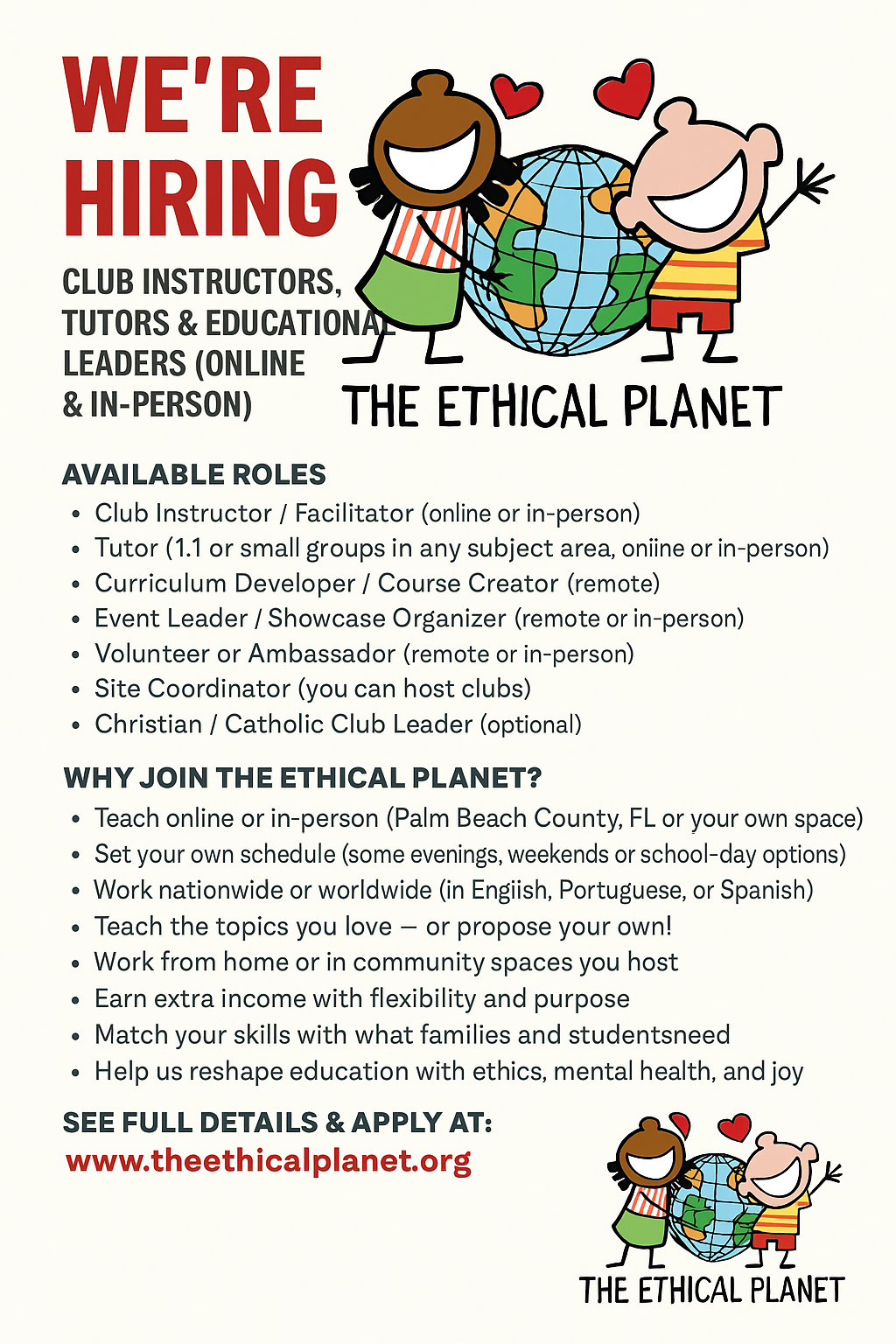 The Ethical Planet, a nonprofit educational organization, welcomes creative and passionate educators and professionals to lead or support our learning clubs. Teach online, in-person (Palm Beach County, FL), or host activities in your own space — all with flexible schedules and meaningful purpose.